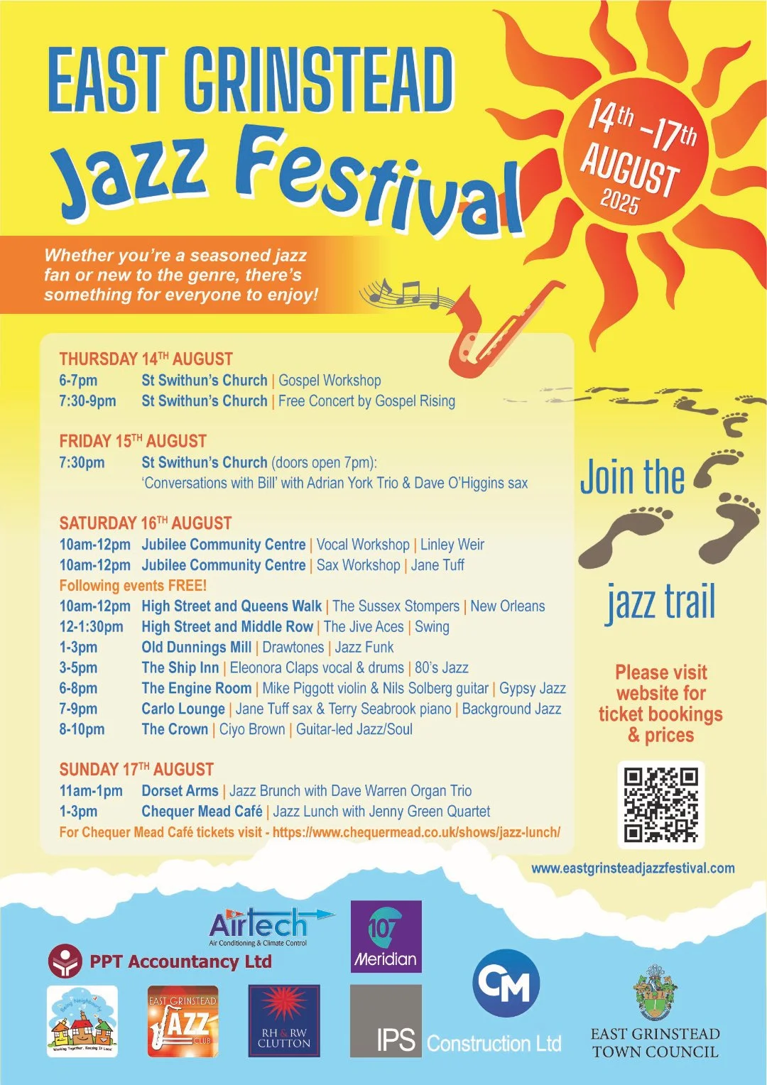 Aug 14 to Aug 17 East Grinstead Summer Jazz Festival Thu, Aug 14, 2025 12:30 PM 12:30 Sun, Aug 17, 2025 11:30 PM 23:30 The Crown (map) Google Calendar ICS View Event →