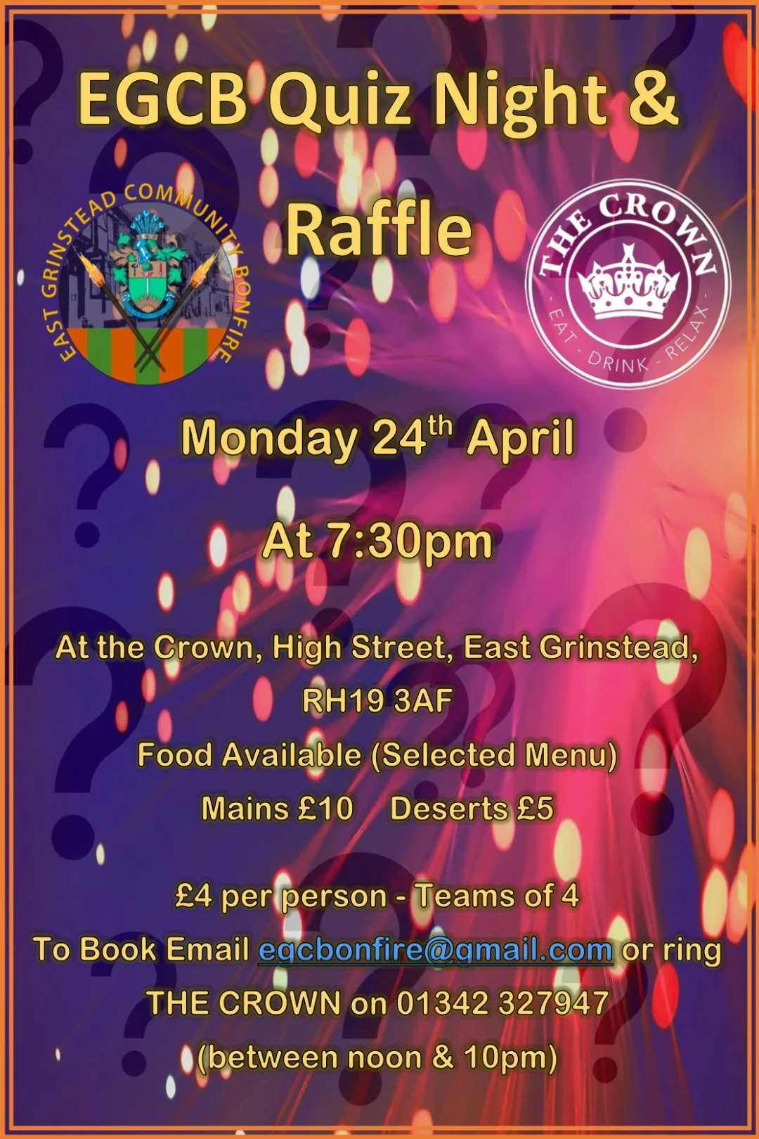 Bonfire Quiz Monday, April 24, 2023 7:30 PM 11:30 PM 19:30 23:30 The Crown 35 High Street East Grinstead, England, RH19 3AF United Kingdom (map) Google Calendar ICS