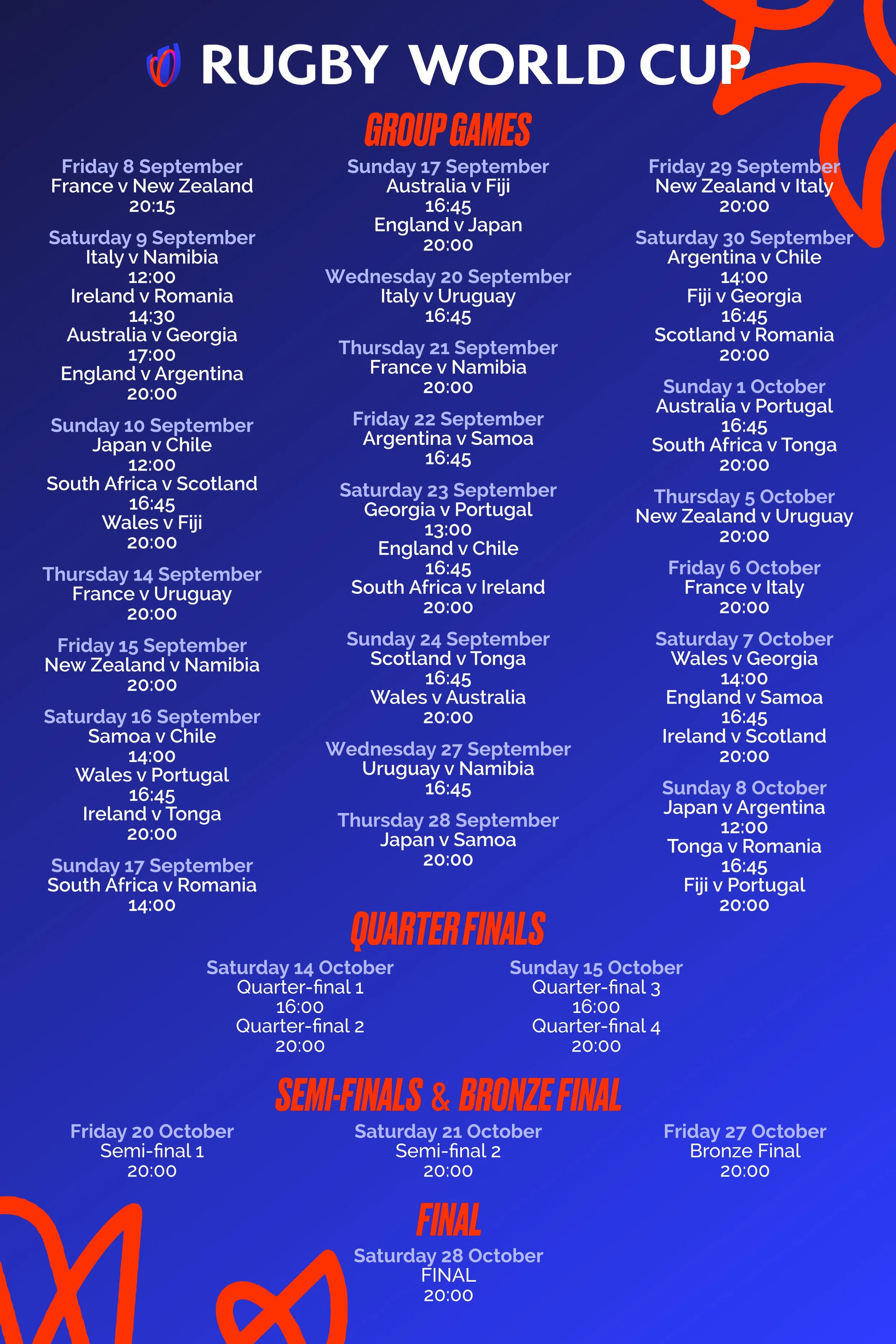 Sep 8 to Oct 28 Rugby World Cup Fixtures Fri, Sep 8, 2023 1:30 PM 13:30 Sat, Oct 28, 2023 11:30 PM 23:30 The Crown (map) Google Calendar ICS View Event →