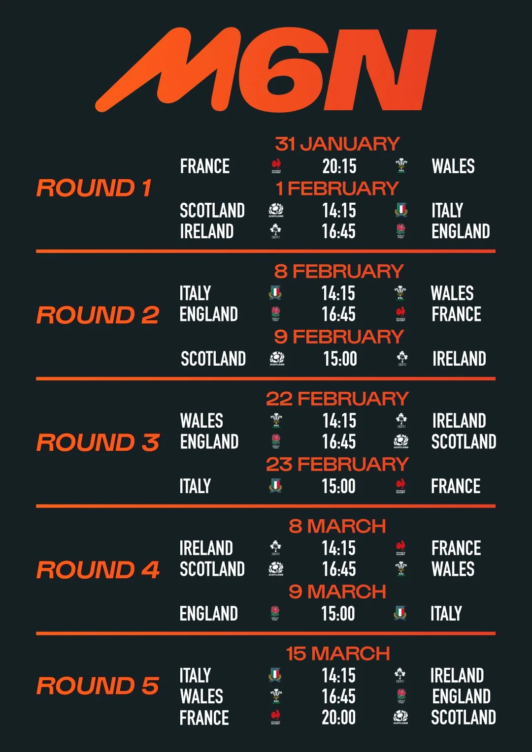 Feb 5 to Mar 14 Rugby 6 Nations 2026 Fixtures Thu, Feb 5, 2026 11:30 AM 11:30 Sat, Mar 14, 2026 11:30 PM 23:30 The Crown (map) Google Calendar ICS View Event →