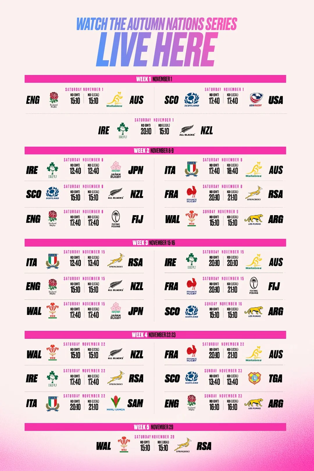 Nov 5 to Nov 30 Autumn Nations Series Fixtures Tue, Nov 5, 2024 12:30 PM 12:30 Sat, Nov 30, 2024 11:30 PM 23:30 The Crown (map) Google Calendar ICS View Event →